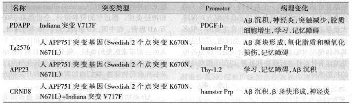 神經(jīng)細(xì)胞β-淀粉樣前體蛋白(myloid beta(A4)precursor protein.APP)基因APP由于變異,被在錯(cuò)誤的位登酶切,形成淀粉樣蛋白(Aβ)沉淀,是AD特征病理變化。利用分子生物學(xué)方法將人源性APP(野生或突變)基因?qū)胄∈蟛⒃谛∈蠡蚪M整合、表達(dá)和遺傳。當(dāng)小鼠過多表達(dá)APP基因或突變基因產(chǎn)物,引起Aβ沉積異常,導(dǎo)致相關(guān)的病理損害及癥狀。表11-1是對(duì)近年來廣泛應(yīng)用的4種APP轉(zhuǎn)基因小鼠的概括。